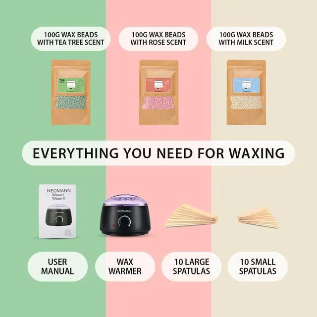 FULL SET & HIGHEST QUALITY: The hot wax set includes a wax warmer with removable, non-stickable pot and 300 g of waxing beads in tea tree, milk and rose flavor. Also included are 10 large and 10 small sticks for easy application to eyebrows, underarms, body, legs, face, nose and bikini line.