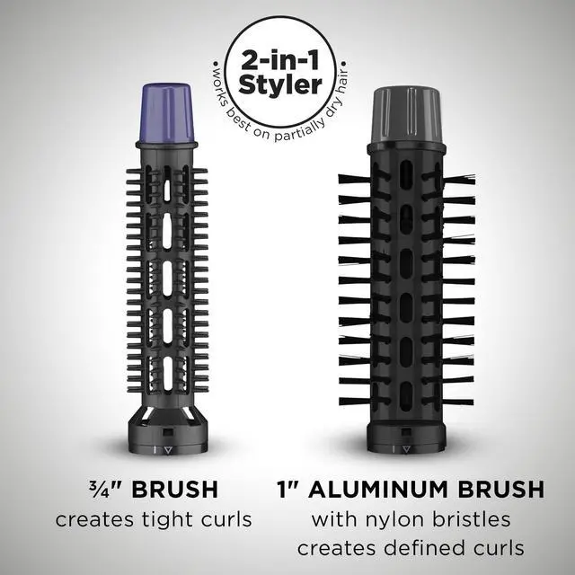 2 In 1 Styling Brush: This 150-watt hot brush includes a 1 inch aluminum barrel brush with nylon bristles for defined curls and a 3/4 inch brush attachment for tight curls; Provides excellent heat transfer for long lasting style