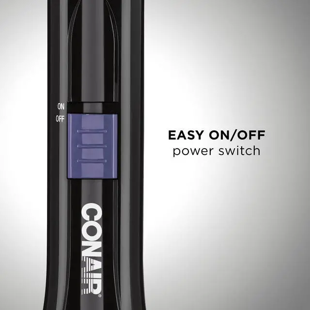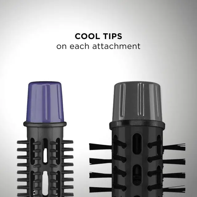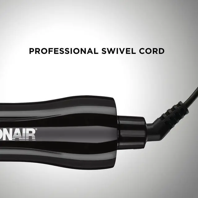 ¾-inch brush attachment for tight curls., | Cool tip for safety and comfort., | Tangle-free swivel cord., | On/Off switch