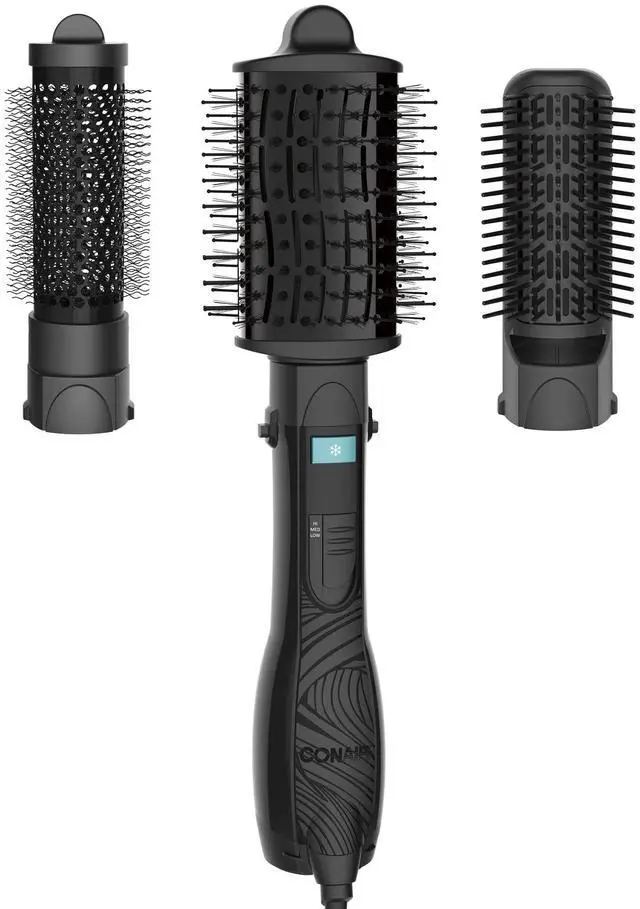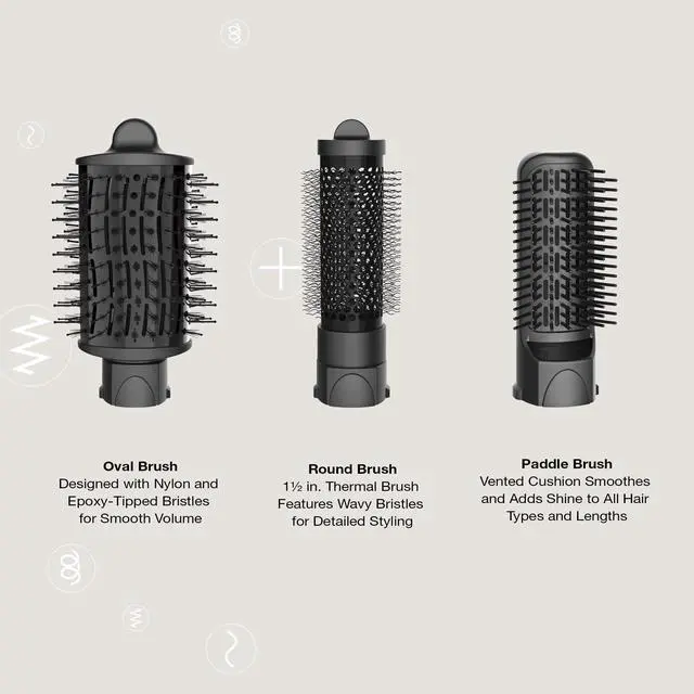 3 Attachments: Oval Brush designed with nylon and epoxy-tipped bristles for smooth volume. Paddle Brush with vented cushion design smooths and adds shine. 1 1/2" Thermal Round Brush with wavy bristles for detailed styling.