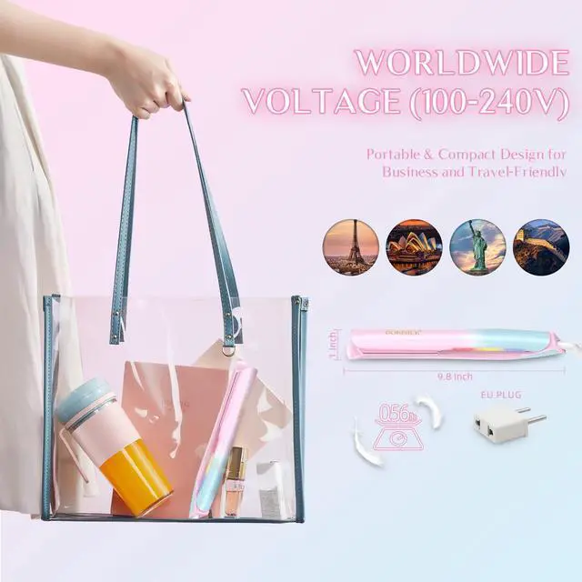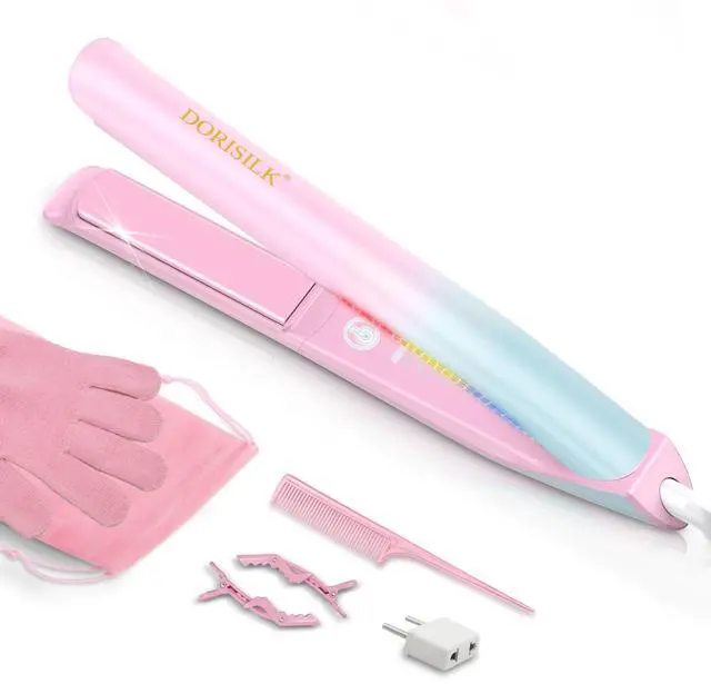 : DORISILK flat iron hair straightener is an excellent companion for European travel and business trips. It features a US standard plug and comes with an EU adapter for effortless international use. Its compact and lightweight design ensure it fits easily into carry-on luggage or bags without taking up much space. With its worldwide voltage (100-240V), this straightner works reliably in different countries, keeping your hair stunned and polished wherever you go.