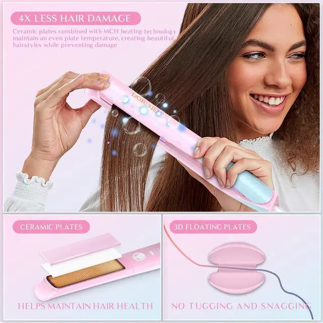 : Our hair iron features advanced ceramic plates that provide a shiny, healthy finish with 4X less hair damage. These plates ensure superior conductivity for even heat distribution, making it easy to achieve long-lasting hairstyles. The 3D floating plates prevents snagging and tugging, ensuring a 2X smoother styling experience. Designed to eliminate frizz and enhance smoothness while maintaining hair health. Say goodbye to hair troubles and hello to a sleek look everyday.