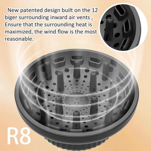 New patented design built on the 12 biger surrounding inward air vents are designedEnsure that the surrounding heat is maximized, the wind flow is the most reasonable, and the faster drying.even when thick, long and frizzy hair as well.