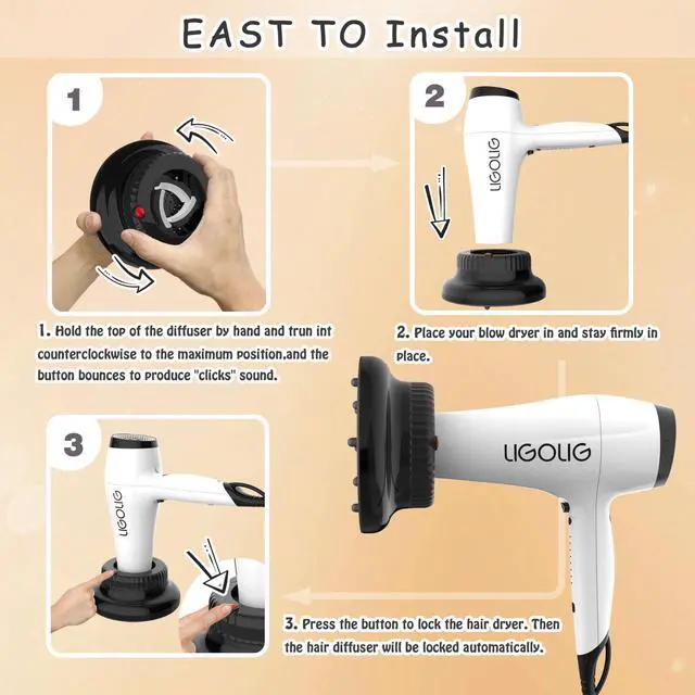 Ligolig diffuser hair dryer effectively reduces frizz, adds volume, defines wavy curls, and enhances the overall texture of your hair. only Twist the top of hair dryer diffuser attachment counterclockwise to enlarge the opening, slip dryer nozzle into hair diffuser and release.Unlock the full potential of your locks with our game-changing hair diffuser. Show off your gorgeous, bouncy curls with utmost confidence and flair.