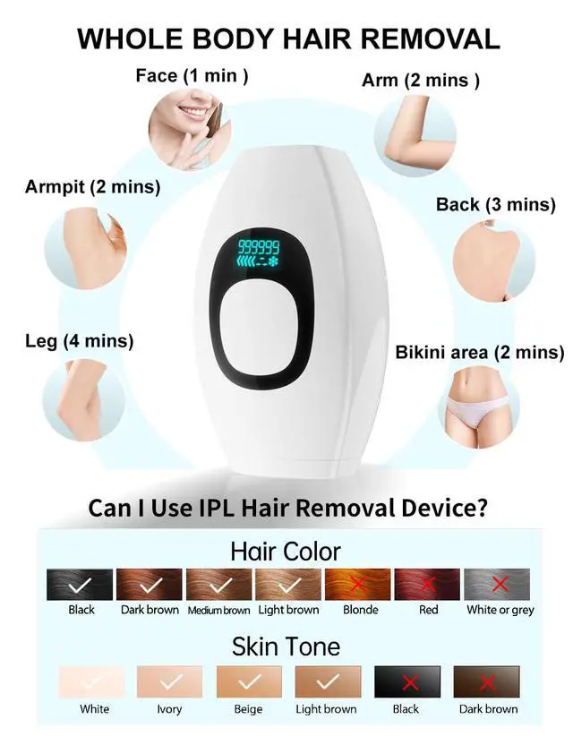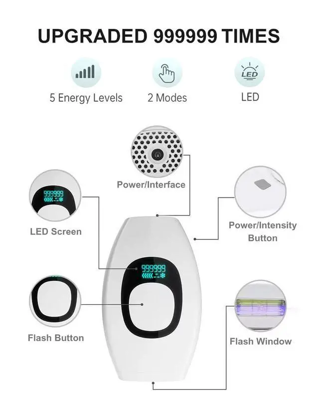 999,999 FlashesOur IPL laser hair removal device comes with 999999 flashes, which means you can use it for a long time for the whole family without worrying about running out of flashes. Say goodbye to the hassle and cost of replacing cartridges frequently