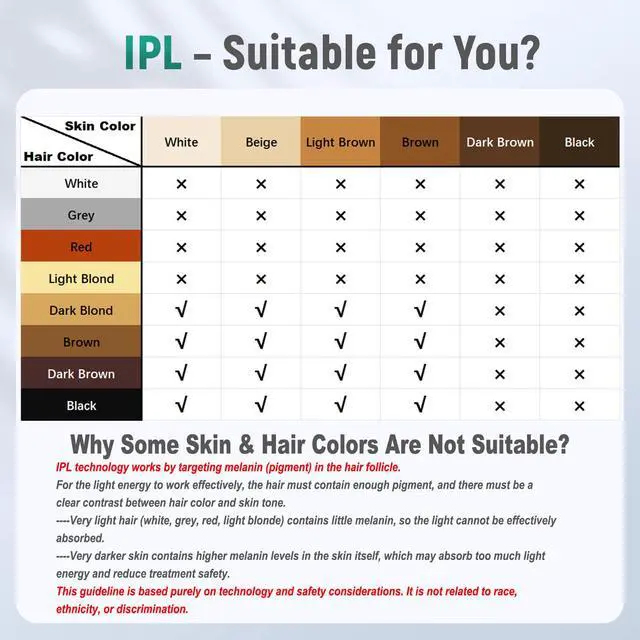 - Very darker skin contains higher melanin levels in the skin itself, which may absorb too much light energy and reduce treatment safety.
