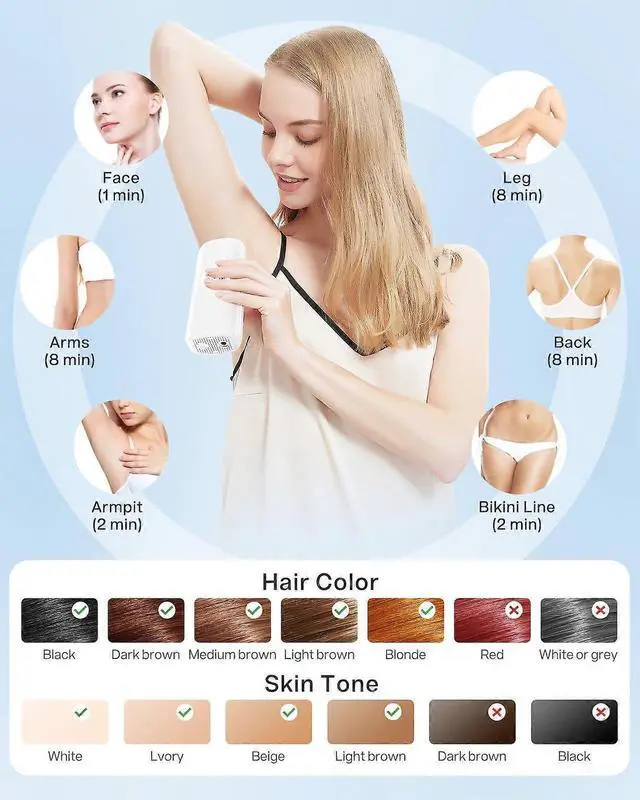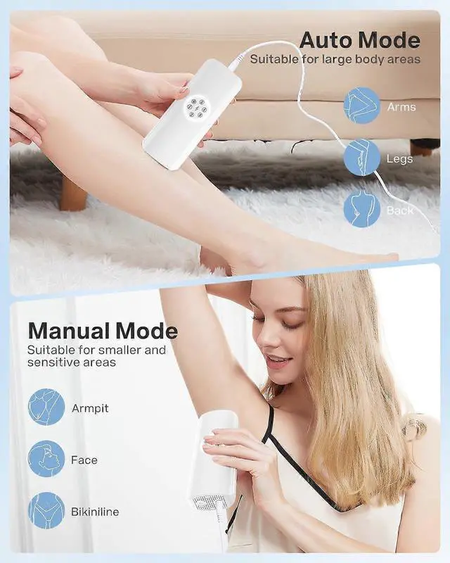 Auto & Manual Modes: Auto mode for large areas like legs and back, manual mode for precise treatment on face and arms.