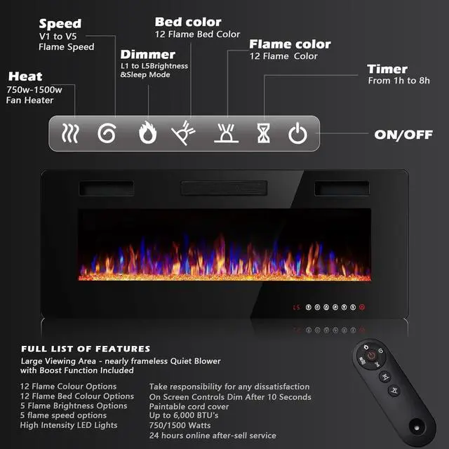 Remote and touch screen make it more convenient to control every function of electric fireplace,power switch,1-8 hours timer control,independent switch of heating and flame,adjustable flame color and speed,sleep mode function.