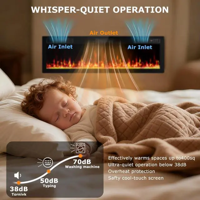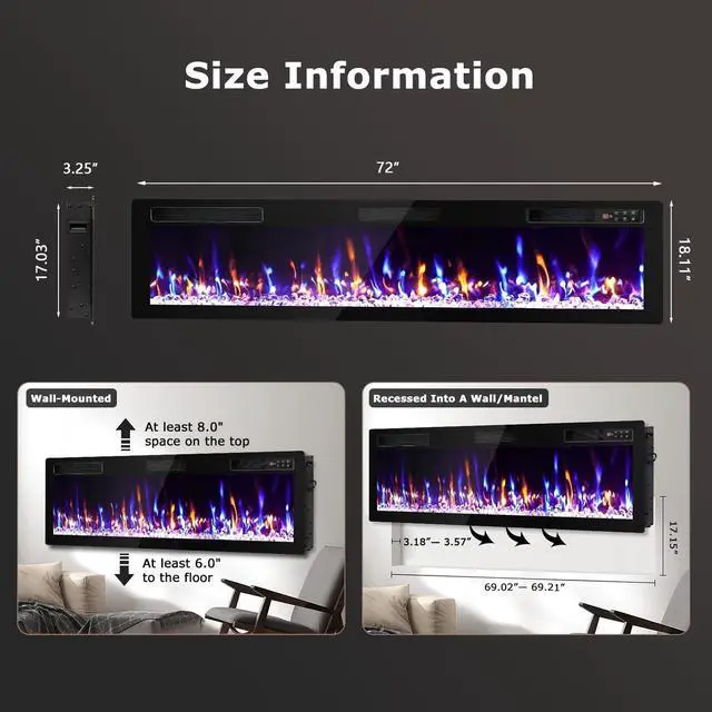 Bossin electric fireplace features a thin, pratical and light design. At 3.85 inches thickness, black linear frame,tempered glass with front air outlet., its a sleek contemporary fireplace perfectly fit for your living room,entertainment center and bedroom.