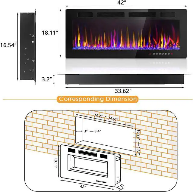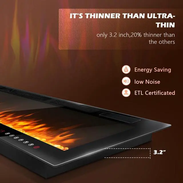 Attractive Flame:There's a button to control the flame color, and a button to control flame bed Color. 12 flame color and bed color ,5 flame speed modes and brightness levels.Simply pick up the remote control provided and choose your most comfortable settingsEnergy Savings and Space saving:750 Watts & 1500 Watts modes can be adjusted.You can choose the temperature you want. You can also make the fireplace display only the flame without heating.At only 3.2 inches thick, it is 20% thinner than other fireplaces.Stylish Decor : This fireplace not only can be Recessed or semi recessed in wall, but also can be Wall Mounted.Once wall-mounted, it doesn't take up extra space on the floor, which makes it an ideal fireplace for those short on space!Safety & Comfort: ETL Certificate Approved. It also has auto-heat kill safety to avoid superheating. Heating is good for maintaining the natural humidity in the air without drying out the room too muchLet electric fireplace warm your home and life