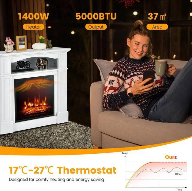 Fast and Efficient Heating: This 1400W powerful electric fireplace with 4650 BTU heat output can heat up space up to 323 square feet quickly, bringing warmth to cold weather. Whats more, the flame effect is turned on with the heating function and cannot be turned off alone.
