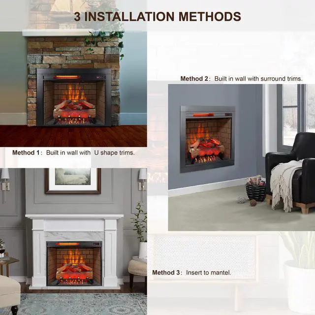 3 installation methods: Built in wall with surround trims&Insert to mantel&Built in wall with U shape trims