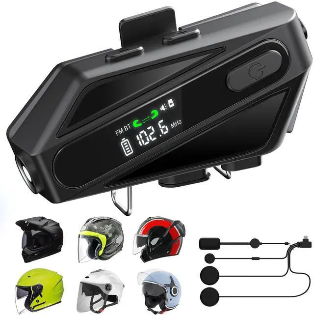 Motorcycle Helmet Bluetooth Speakers Headset with LED Screen, 2-Way Helmet Intercom System Headphone with 2 Type Mics, TF Card Slot, Hands-Free FM Music/Call, 1000mAh Battery, IPX6, Noise Cancellation