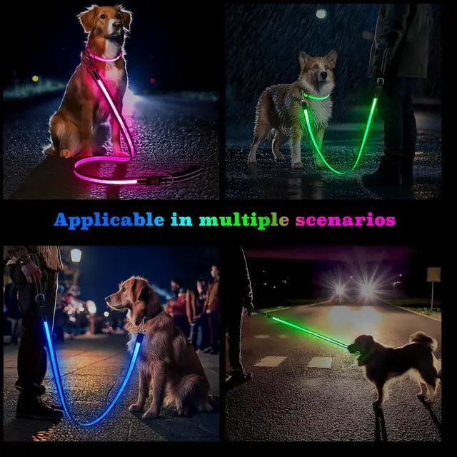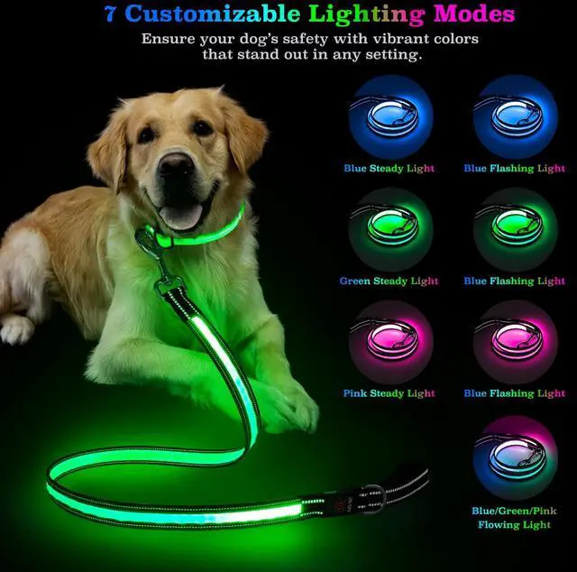 7 Lighting Modes for Enhanced Visibility: This dog leash with light offers 7 lighting modes, including blue, green, and pink always on or slow flash, plus a flowing flash mode. Customize your light up dog leash for optimal visibility, ensuring safety during night walks.