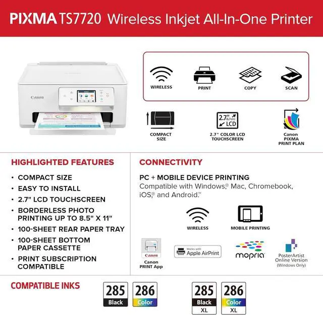 PIXMA TS7720 Wireless All-in-One Inkjet Printer Print, Copy, Scan Auto Duplex, 15/10 PPM, 2.7 Touchscreen, Compact Home Photo Printer with Easy Setup