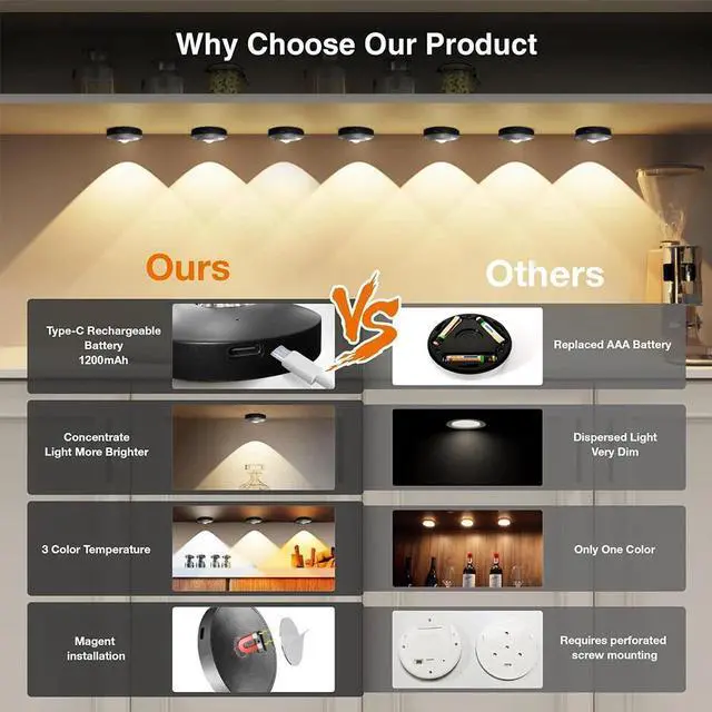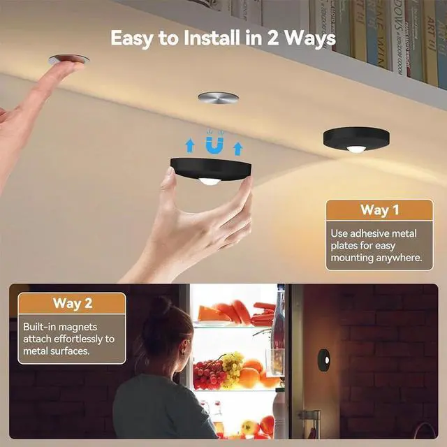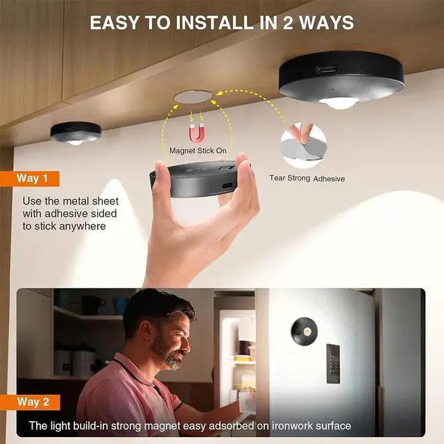 Easy Install: Method : Each wireless under cabinet lighting comes with magnetism, just attach the lights to iron products. Method : Equipped with a sticker mounting disk, install in 3 seconds at any where you want. Easily take the magnetic tap lights off, wireless portable for anywhere, for closet, cabinet, bedroom, kitchen...