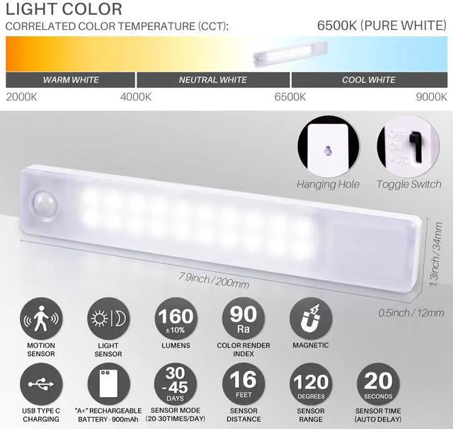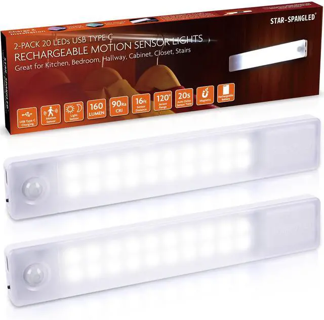This rechargeable motion sensor light will turns on when a movement is detected in the DARK. It will turn off within 20 seconds after detecting your LAST motion. It is perfect for Cabinet, Closet, Counter, Stairs, Kitchen, Bedroom, Storage room, Hallway, Dollhouse, Safe box.