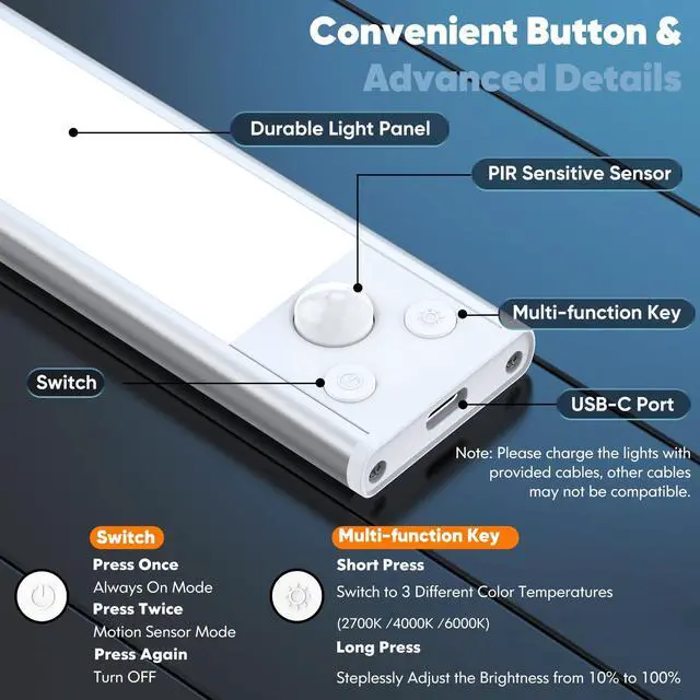 Updated to combine with 3 color temperatures, these under cabinet lights can be easily adjusted to your favorite lighting effect by simply pressing the button, bringing you specific lighting atmospheres for your home.