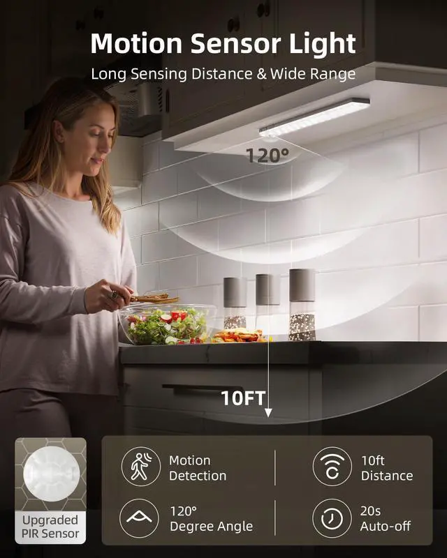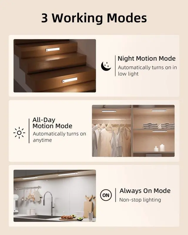 Three Modes for Every Need: The motion sensor light detects motion within 10 ft and a 120° field, automatically turning on and off after 20 seconds of no movement. [Night Motion Mode] activates in darkness or low light, perfect for late-night useno more stumbling for the switch. [All-Day Motion Mode] works anytime motion is detected, ideal for dim areas where your main lights don't reach. [Always-On Mode] provides continuous illumination for long tasks and can also be used as a flashlight or during power outages and camping.