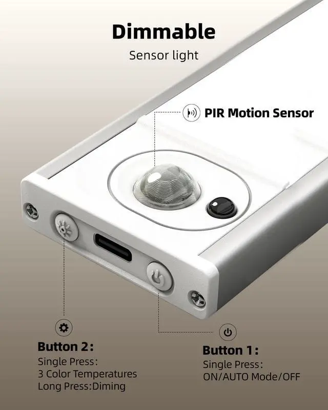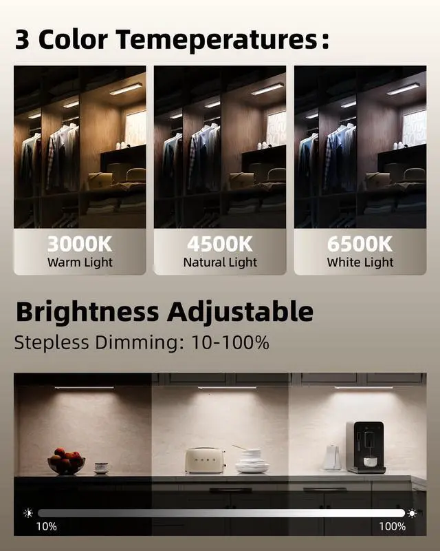 3 Color Temperatures & Adjustable Brightness: These motion sensor closet lights let you choose from Warm (3000K), Warm White (4500K), or White (6500K) lighting to suit any scene. Easily switch color temperatures with a press and adjust brightness from 10%100% by long-pressingcomfortable lighting for your eyes at any time.