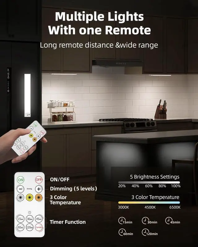 Dual Remote Control & Timer Function: These under-cabinet lights include 2 IR remote controls for convenient wireless operation. Set the closet lights to always on/off, adjust brightness, change color temperatures, or set a timer (15120 minutes) to customize lighting duration effortlessly.