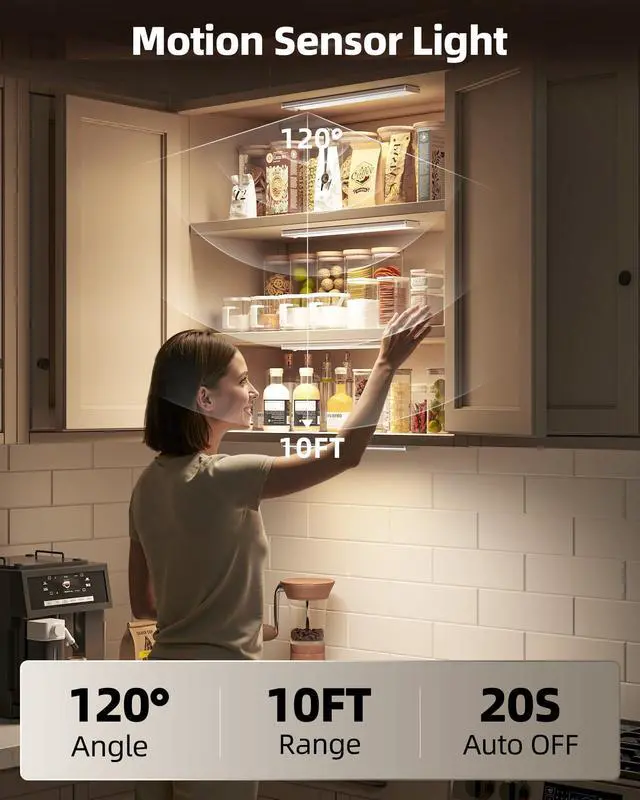 Upgraded Motion Sensor Lights: This rechargeable under cabinet light is equipped with a motion sensor mode. In this mode, the light detects motion within a 10 ft range and a 120° field. It automatically turns on and then switches off after 20 seconds of no movement. Please note that this mode activates only in low-light conditions, making it perfect for late-night use. No more stumbling in the dark trying to find a light switch.