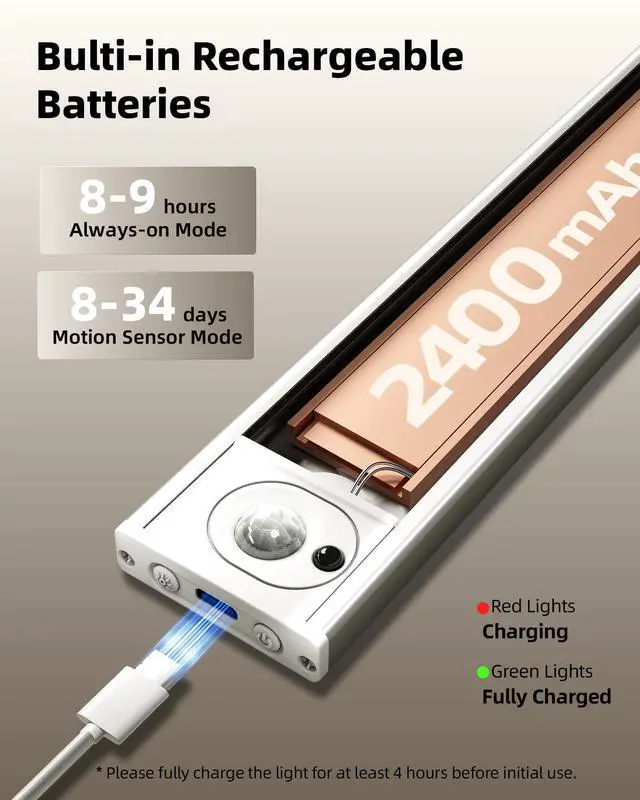 Long-Lasting Battery & USB Charging: The motion sensor indoor light is equipped with a 2400 mAh rechargeable battery and can be easily recharged via Type-C. One full charge can last up to 834 days in Motion Sensor Mode (depending on how often you use it) and 89 hours in Always-On Mode at 100% brightness.