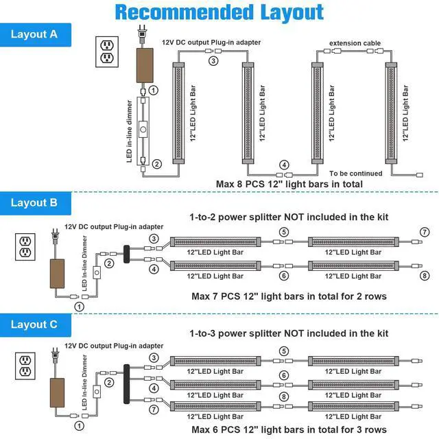 - For installing this 6-bar under cabinet led lighting kit in different rooms, you can buy extra power supply and PWM LED dimmers to make them into 2 lighting kits. You can find them by searching "Litever 12V 3A power supply" & "Litever PWM LED dimmer".