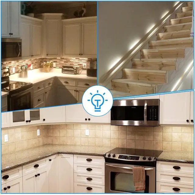 Of course, besides kitchen under cabinet lighting, you can find various and diverse applications for this under cabinet lighting kit: above kitchen cabinet lighting, laundry room/garage cabinet light or any other cabinet light, kitchen display cabinet light, bookcase lights, bookshelf or any other shelf lights, wired wardrobe lights, closet lighting, collection showcase lighting, cupboard lights, accent lights for work bench, over desk light, etc.