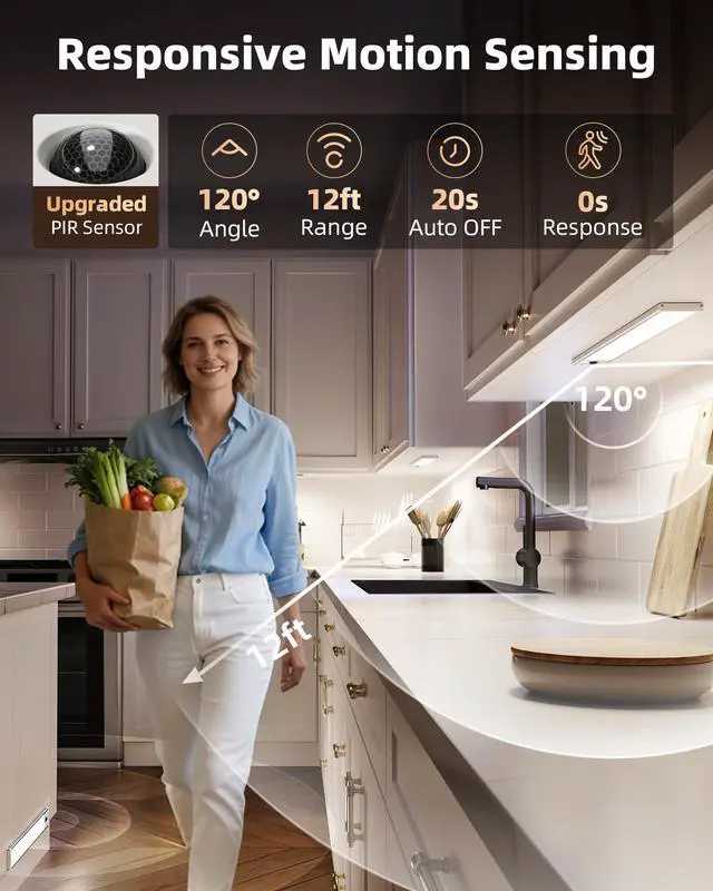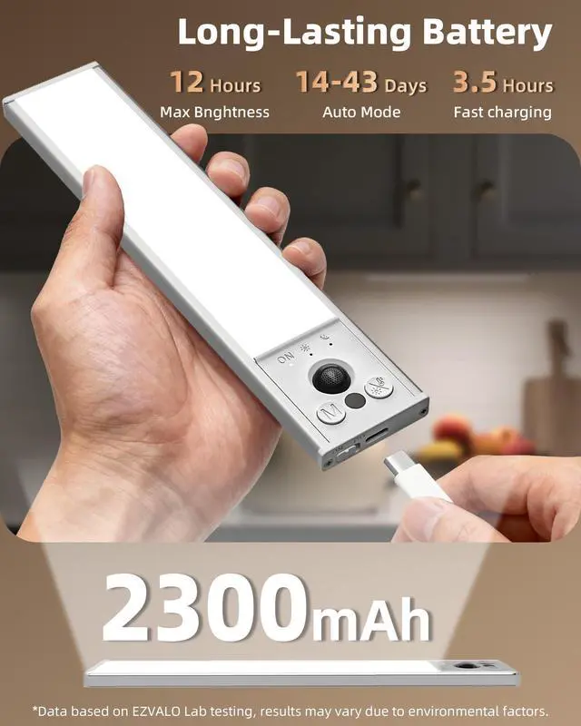 Long-Lasting & Rechargeable Under Cabinet Lighting: These wireless under cabinet lights feature a built-in 2300mAh battery that delivers up to 12 hours of continuous lighting at maximum brightness or 1443 days in motion-sensing mode (depending on usage frequency) and fully recharges in just 3.5 hours no frequent charging needed! (4 Type-C cables included)