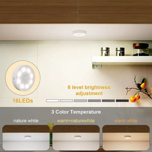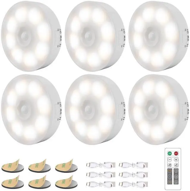 ![Alt view image 6 of 7 - 6 Pack Under Cabinet Lights [with Remote], 16 LEDs Wireless Motion Sensor Light Puck Light, 3 Color Temps Dimmable 3000-6000K, Rechargeable Closet Lights for Cabinet, Closet, Kitchen, Hallway, Stairs](https://c1.neweggimages.com/productimage/nb640/C5DWD260323069Y8X09.jpg)