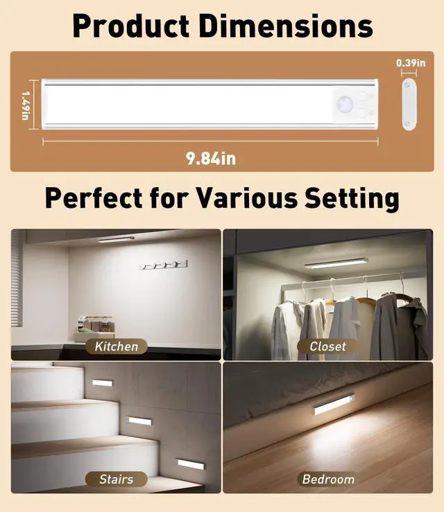 Dimmable & Change Color: Sensor lights indoor truly shine with their remarkable versatility. Closet lighting allows you to choose 3 color temps (3000K warm/4500K natural/6000K cool) and 10 brightness levels. Dial up the illumination for cooking or prepping tasks, or dim it down for a soft ambient glowideal for various kitchen activities, organization, or setting a relaxing mood