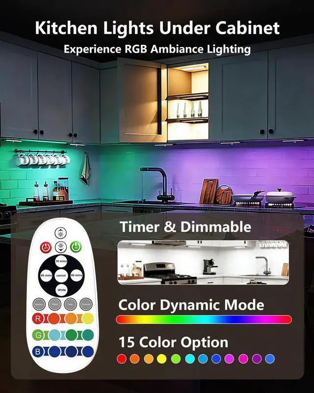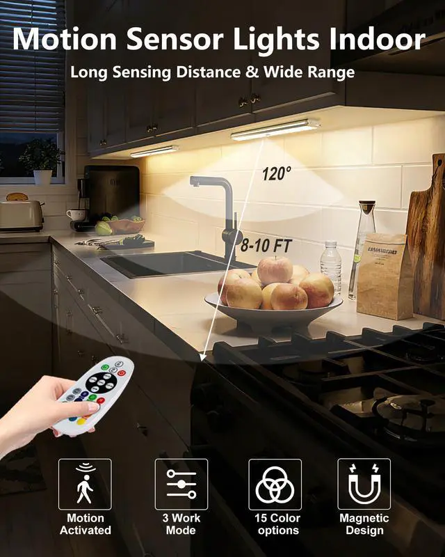 Motion Sensor & Remote Control : The under cabinet lights wireless have 2 modes: motion sensor and remote control. The sensor mode activates when human motion is detected within 10-13ft and automatically turns off after 15-20s. The motion sensor lights can also be controlled with the included remote; allowing for easy on/off, timer settings, dimming, and color switching. Measure 7.87" L x 1.57" W x 0.51" T, they are lightweight and ideal for providing auxiliary lighting in hard-to-reach areas.