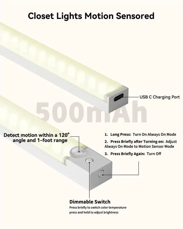 • USB Rechargeable Closet Light Battery Operated Our closet lights motion sensored equipped with a built-in rechargeable 600mAh lithium battery. In Always-On mode, it can stay illuminated for 5-6 hours with the maximum brightness. In AUTO mode, it can last for 20-30 days with an illumination frequency of 10-20 times daily for 30s each. The Type-C charging interface is convenient for charging, supporting the universal Type-C interface, no need dedicated charger (5V)