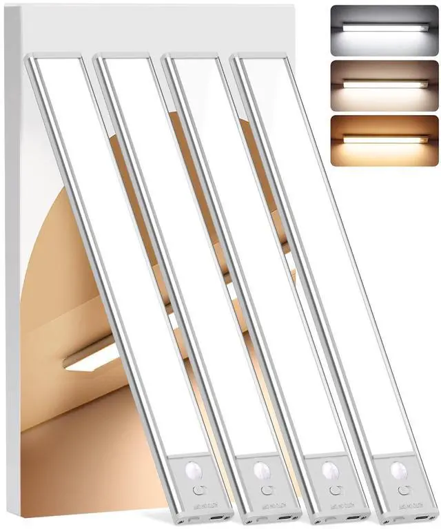 Under Cabinet Lighting Wireless, 4Pack Motion Sensor Light Indoor with 3 Color Temps, Dimmable Closet Lights Battery Operated, LED Magnetic Light, Rechargeable Under Counter Lights for Kitchen Home
