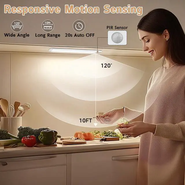 Upgraded Motion Sensor Light Indoor: In dark or low light environments, when motion activated under cabinet lights detects human movement within the range of 10ft/120°, it will automatically light up. Plus, if no motion is detected after 20 seconds, kitchen lights under cabinet will automatically turn off to conserve energy. No longer have to worry about tripping on the step in the dark trying to turn on the switch.