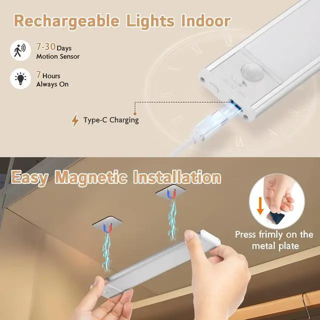USB Rechargeable & Energy Saving: LED closet lights have a built-in large rechargeable battery, no need to worry about wiring like other styles, it can be quickly charged via Type-C cable. And closet lights battery operated can work for about 30 days in motion sensing mode without frequent recharging. In addition, the closet light can be set to the always-on mode and illuminate continuously for about 7 hours at 100% brightness, as a work light.