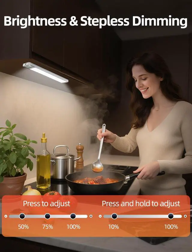 [Ultra Bright 6000K Daylight LED Closet Light] Transform your walk-in closet or kitchen cabinets with this professional-grade under cabinet lighting. The 6000K daylight white LEDs deliver crystal-clear illumination perfect for color-matching outfits or food preparation, with true-to-life colors. Featuring 10%-100% stepless dimming controlled by a simple touch button, easily switch between bright task lighting for detailed work and soft ambient glow for nighttime navigation.
