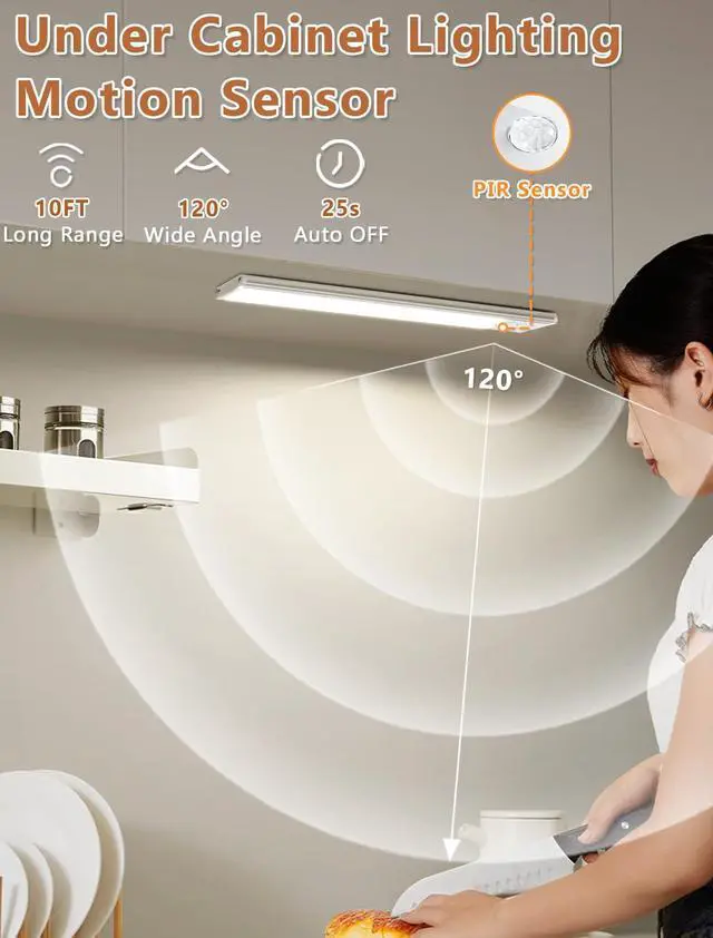 Military-Grade Motion Detection System: Combines infrared sensor (120° detection angle) and microwave radar (10ft/3m range) for dual-layer accuracy. Activates in 0.3sfaster than human blink responsewith 25s auto-shutoff adjustable via hidden jumper. Exclusive light sensor prevents daytime activation. Tested to withstand -20°C~60°C environments, ideal for freezer rooms or garage cabinets.