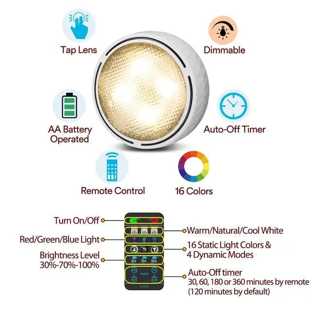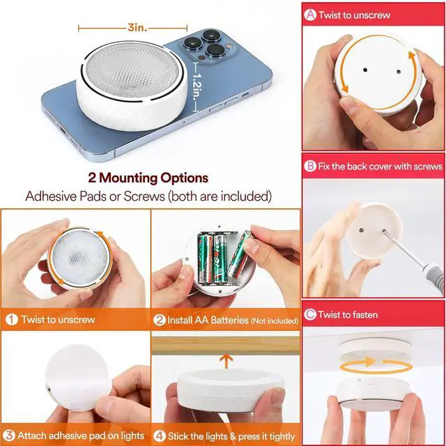 - No wiring needed, each puck light operates on 3x 1.5V AA batteries (not included), perfect for adding lighting to your kitchen, cabinet, closet, shelf and more.