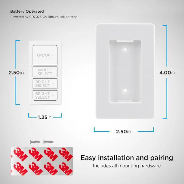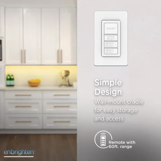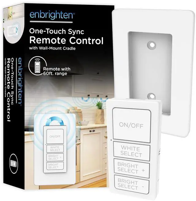 Upgrade your own personal lighting system with Enbrighten One-Touch Sync Remote Control. This intuitive add-on light switch easily pairs with your compatible Enbrighten plug-in light fixtures to create an extra level of control and customization. While previous lighting setups required each individual light to be activated and adjusted one by one, this wireless RF remote control empowers you to manage all your compatible lights with one click. Now you can use the remote control to turn multiple lights ON/OFF, access the 10-100% dimming feature and select your preferred color temperature, ranging from soft white light to bright daylight. Mounting the remote control switch to a wall, while optional, is easy to do with the included hardware. No direct wiring means you can install it anywhere thats convenient for you, provided its within a 60ft. range. Additionally, this white light switch comes with a rocker-style wallplate that can be added to create a finished look and blend seamlessly with your décor. Pairing the remote takes seconds, and the clearly labeled buttons make operating your LED setup easy. Take control of customizing your homes lighting setup with the Enbrighten One-Touch Sync Remote Control lighting for life!