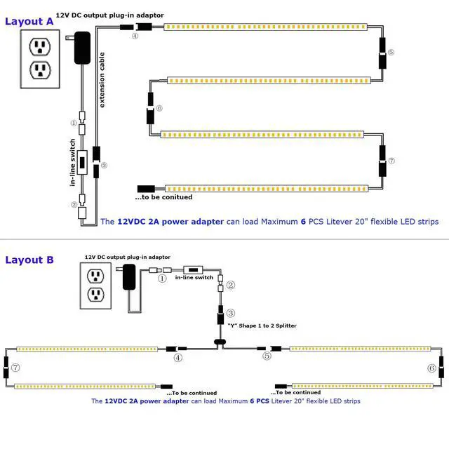 - 10 pcs Litever 20" flexible LED strips is the Absolute Maximum Quantity Workable in BOTH Layout A & B, even if you use power adapter of higher power load than 12VDC 3A (36W).