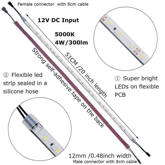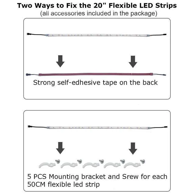 - Those flexible LED cabinet light strips can be mounted either by the self-adhesive tapes on the back or the supplied mounting clips and screws.