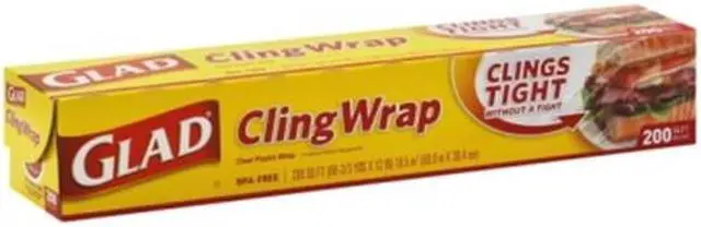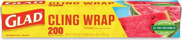 Glad ClingWrap extends your foods freshness by keeping air out with a superior seal cling versus the national brand. With 3X the freshness based on moisture loss in produce versus no protection, keep your foods fresher longer. Its easy-to-use roll makes protecting your favorite foods fast and simple. This food wrap is easy to handle and grips to a variety of surfaces, such as glass and metal, making it useful for portioning, preparing, steaming and protecting. ClingWrap can be used outside of the kitchen too. It is great to use for preventing leaks in toiletries when traveling, wrapping wet paint brushes to use later, or keeping items in drawers when moving. Glad ClingWrap contains no plasticizer, and is BPA free and microwave safe. Ideal for use in restaurants, cafeterias and other food service facilities. Glad protects and seals with ease. Material(s): Plastic; Length: 200 ft; Width: 12"; Product Packaging: Box.
