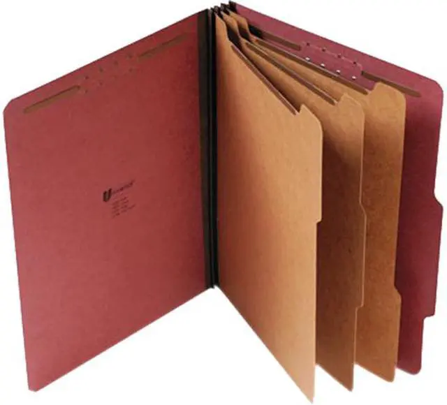 Protect your paperwork with moisture-resistant classification folders. The multiple fasteners and dividers allow you to create subcategories for home or office filing. Customized filing allows you to simply sort and seek paperwork by subject or document type. 2/5-cut tabs with dividers provide space for labeling and easy file identification. Folders are built with heavyweight paper construction to withstand repeated use. Eight-Section. Folder Size: Letter; Total Number of Dividers: 3; Total Number of Fasteners: 8; Max Folder Expansion: 3".
