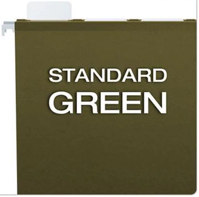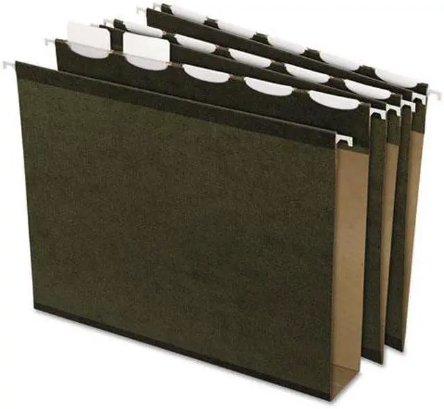 Pendaflex Ready-Tab extra-capacity hanging folders feature 5 built-in tabs for faster file setup. Simply lift the tab in the position you need. The 2" capacity with cardboard reinforcement insert easily accommodates large files, and the folder is reinforced at top edge and bottom fold for additional durability. Letter size. Standard Green.