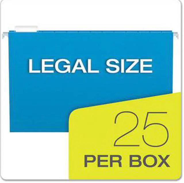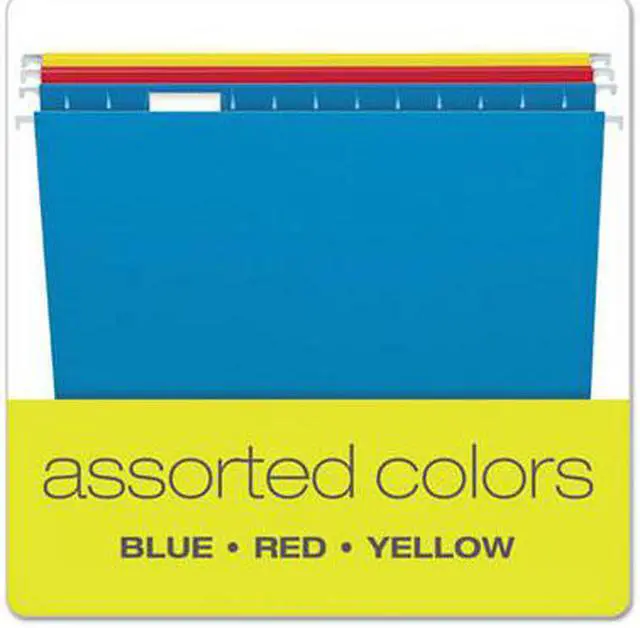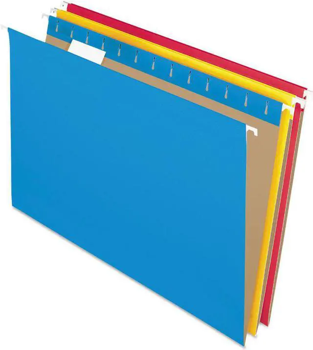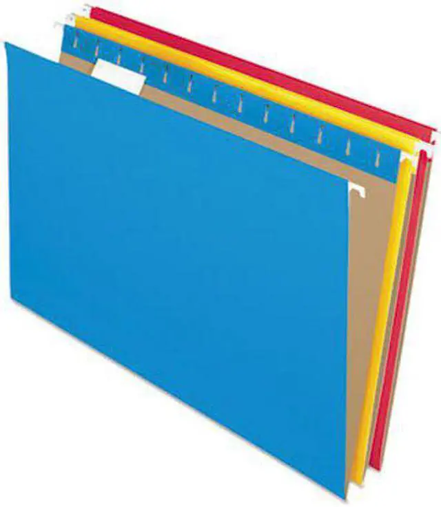 Pendaflex Essentials Hanging Folders are perfect for everyday filing projects. They include 25 label inserts and clear tabs for placement in 5 positions. Paper made from 10% recycled fiber with 10% post-consumer fiber. Legal size. Assorted colors: blue, yellow, red. 25 Per box.