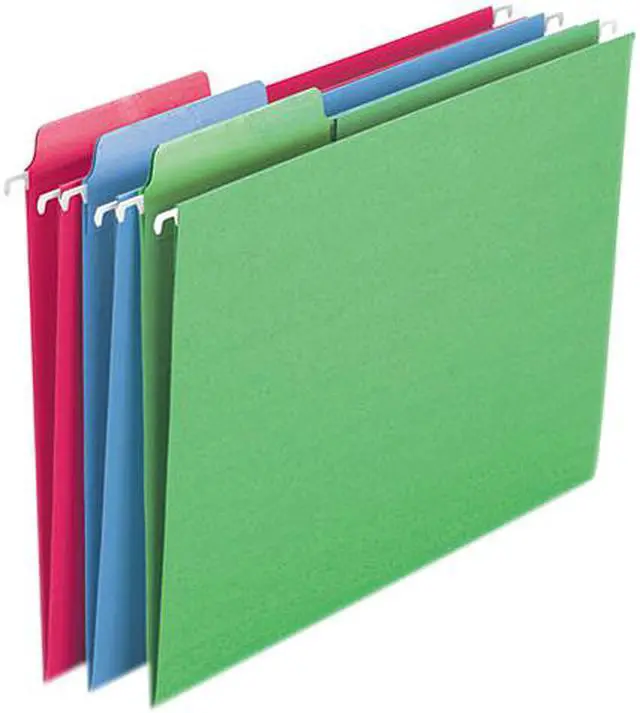 Hanging file folders are designed with an erasable surface that makes it possible to revise and reuse them. You can write directly on the tab with a permanent marker and easily erase with a standard white eraser. These folders have built-in reinforced tabs attached to the folder for hassle-free filing. No assembly required. Folder Size Type: Letter; Folder Color: Assorted; Color Family: Multicolor; Folder Color Assortment: Blue; Green; Red.