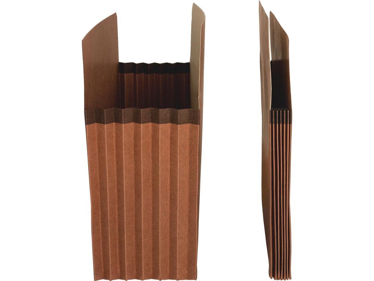 Accordion design with reinforced gussets for flexible expansion. 30% post-consumer materials.