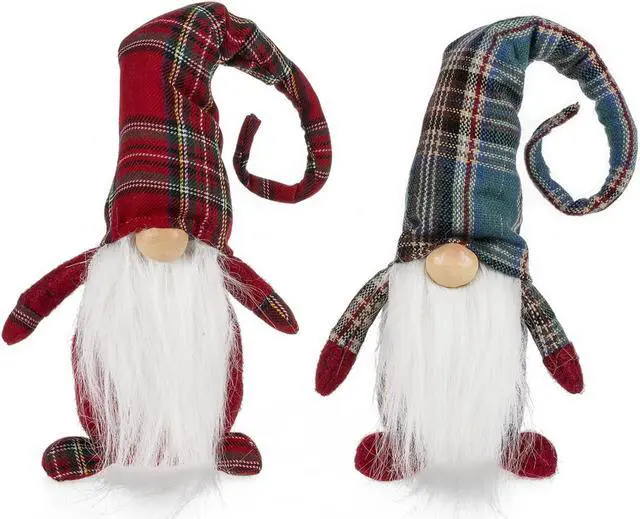 Measures 19 x 2 1/4 x 2 1/4 inches each. Made of fabric and polyester stuffing. Features include faux fur beard, weighted bottom, wire in hat to style as desired. Set of 2 includes one of each design. Made by Midwest, imported